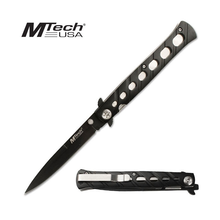 The MTech Manual Skeletonized Stiletto is a striking and functional folding knife that blends style with performance. Featuring a 3.5" black-coated stainless steel blade, this knife is designed with a false edge and needle-like point for precision cutting. The blade’s sabre grind enhances its strength and sharpness, making it an excellent tool for everyday tasks or as a collector's item.